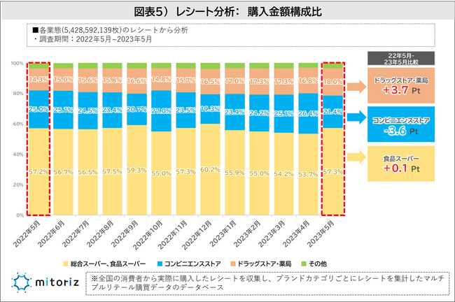 2022年5月から2023年5月にPOB会員が投稿したレシートデータをもとにアルコール商品の購買行動の変化を分析します。各業態の購入金額の構成比は、「総合スーパー、食品スーパー」「コンビニエンスストア」「ドラッグストア・薬局」の順となりました。2022年5月と2023年5月で比較すると「総合スーパー、食品スーパー(+0.1Pt)」の変化は大きくありませんが、「コンビニエンスストア(-3.6Pt)」が減少し、「ドラッグストア・薬局(+3.7Pt)」が上昇しています。価格の高いコンビニではなく、価格が安く、ポイントも貯められる「ドラッグストア・薬局」の利用が増えている様子が伺えます(図表5)。