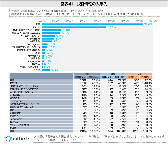 お酒の情報を得る先は「店頭(72.4%)」が最も多く、次点の「TVCM(46.3%)」と大きな差