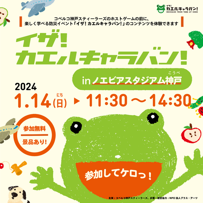 コベルコ神戸スティーラーズは、NTTリーグワン2023-24のホストゲーム第3戦となる1月14日(日)クボタスピアーズ船橋・東京ベイ戦を「神戸市民応援デー」と位置付け、「震災を忘れない」をテーマに様々なイベントやブース出展を実施いたします。その中で、この度NPO法人プラス・アーツ協力の下、楽しみながらしっかり学べる防災訓練イベント「イザ!カエルキャラバン! Inノエビアスタジアム神戸」を開催する事が決まりました。