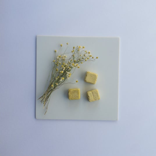 1.WanSoupのキューブをお皿に入れてキューブ1つあたり大さじ2(約30ml)のお湯をかけます。