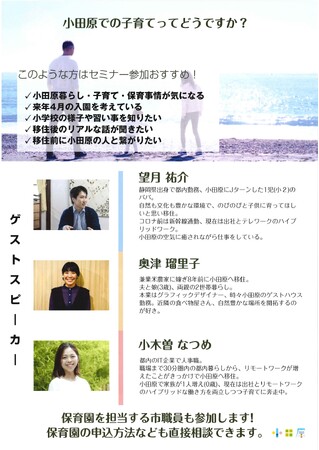さらに、小田原市役所の保育課職員も参加しますので、本市の保育園事情や遊び場、習い事、コミュニティなどについて直接相談できることに加え、移住する際の保育園の手続き方法など、「移住」「子育て」についてさまざまな事を聞くチャンスですので、ぜひ参加ください!