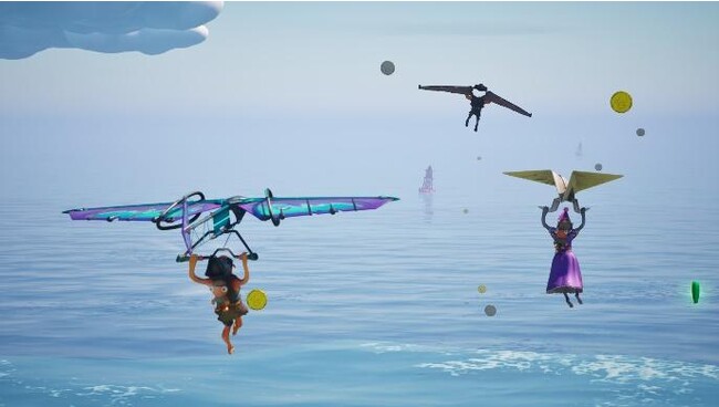 プラットフォームから飛び立ったプレイヤーは、空中のコイン(上昇気流発生)やハート(スタミナ回復)などのアイテムを駆使して、より遠くへ滑空し記録を狙います。遥か彼方には幻のゴール島も…!?