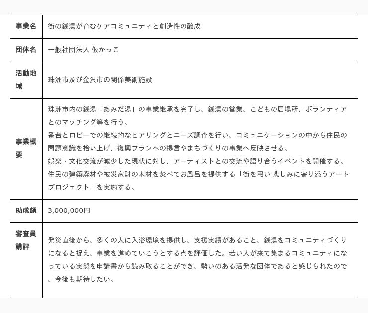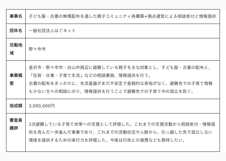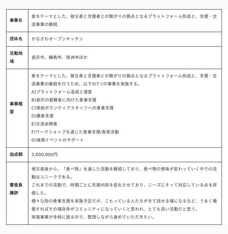概要 :被災者の生活再建や被災地域の復興のための中長期的な活動を支える支援金や活動ノウハウの提供
