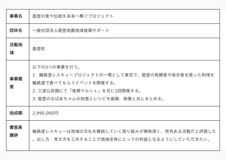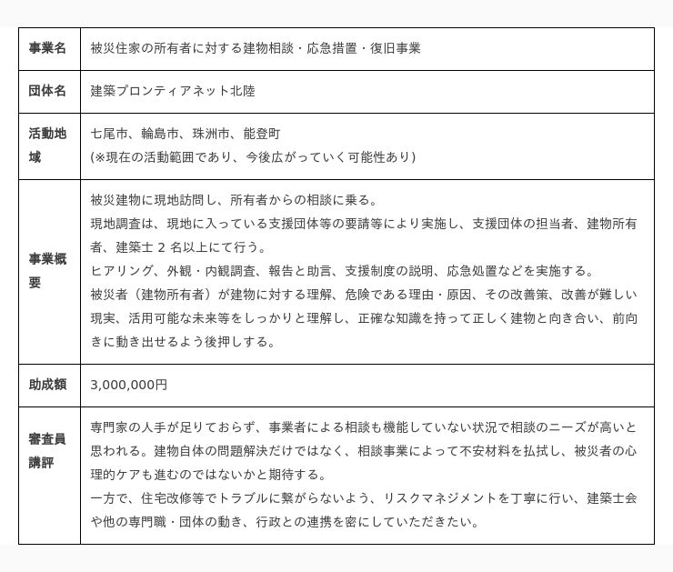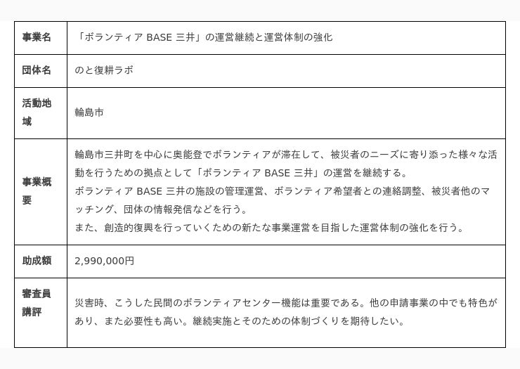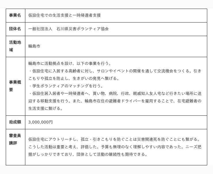限られた助成財源の中、今回は災害支援の助成実績のある全国のコミュニティ財団の方々に審査を行っていただき、石川県での復旧・復興活動の現状と、事業期間終了までに求められる支援活動等の状況を鑑み、被災された方々への支援につながると判断したものを助成先として決定しました。