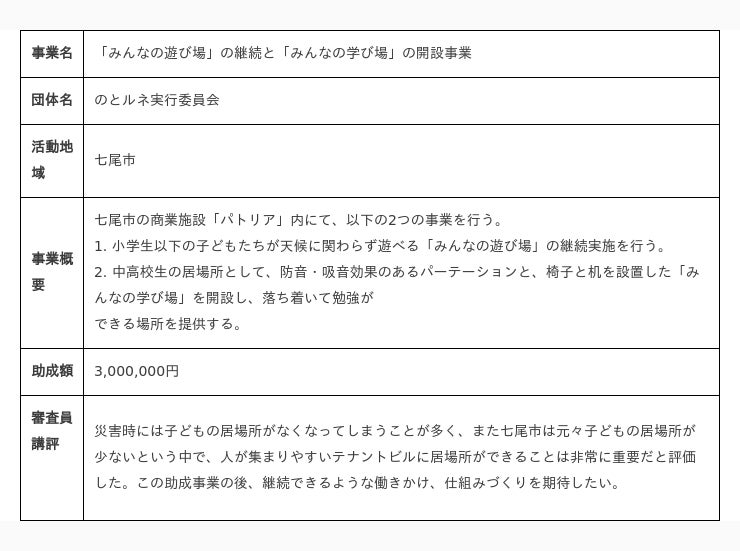 概要 :緊急時から復旧期・復興期まで被災地で支援を行う団体への支援金や活動ノウハウの提供