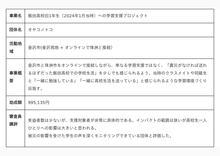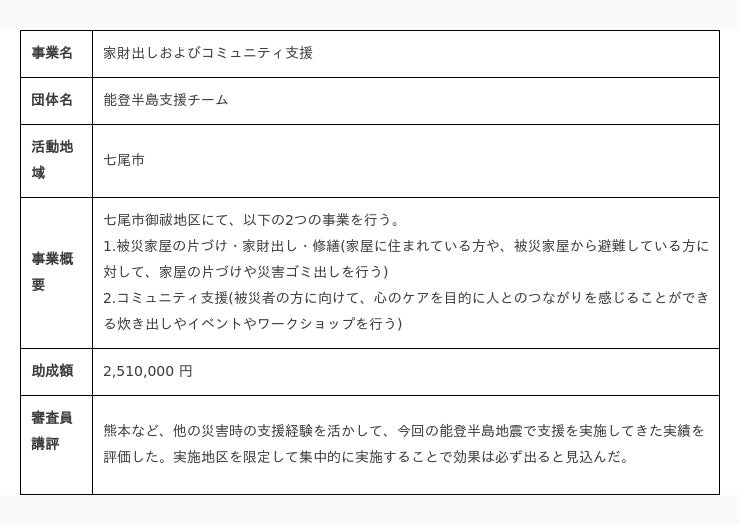 この度、新たな助成事業「つづける支援活動助成」を立ち上げ、緊急期の支援のみならず、能登半島地震により被災された方々の生活再建に必要な支援を継続する11団体への助成が決定しました。助成総額は30,490,135 円となります。