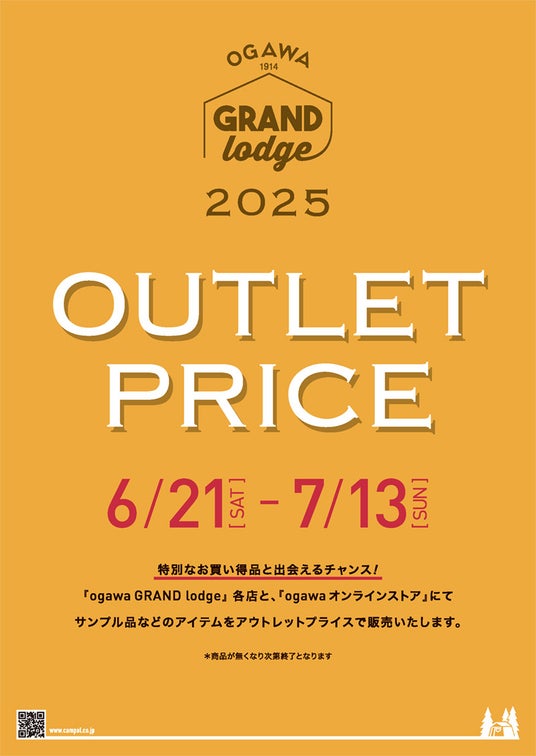 創業110年を越えるアウトドアブランド『ogawa(オガワ)』(キャンパルジャパン株式会社/代表取締役社長:伊川良雄)では、ogawaコンセプトストア『GRAND lodge』、ogawa公式オンラインストアにて、日頃のご愛顧に感謝を込めて、『アウトレット品』をスペシャルなプライスでご提供する販売会を実施いたします。