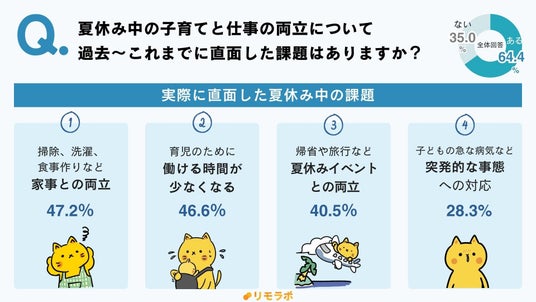 リモートワークは夏休み中の子育てとの両立において有効だと感じていてる一方、64.4%が「課題に直面したことがある」と回答