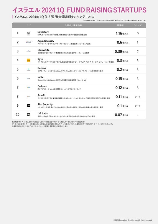 タイトル:イスラエルスタートアップ資金調達額ランキングTOP10(2024年 1Q)