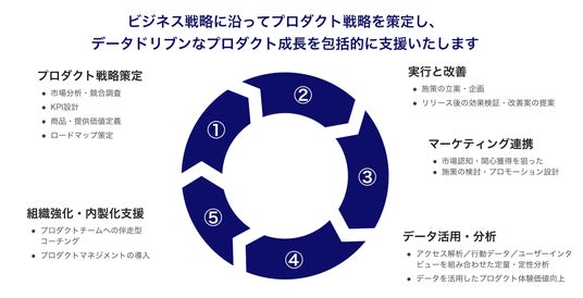 本サービスではこうした課題を解消すべく、経験豊富なプロダクトマネージャー(伴走PdM)が戦略策定から実行、改善までを一貫して支援。市場調査、データ分析、KPI設計、開発優先度判断まで伴走し、プロダクトの持続的成長や価値創出をサポートします。
