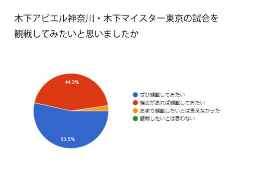 「木下アビエル神奈川・木下マイスター東京の試合を観たいか」という質問にもポジティブなご回答をいただきました。この「企業対抗交流戦」を機に、より多くの方にTリーグ、木下アビエル神奈川・木下マイスター東京に関心を寄せていただければうれしく思います。