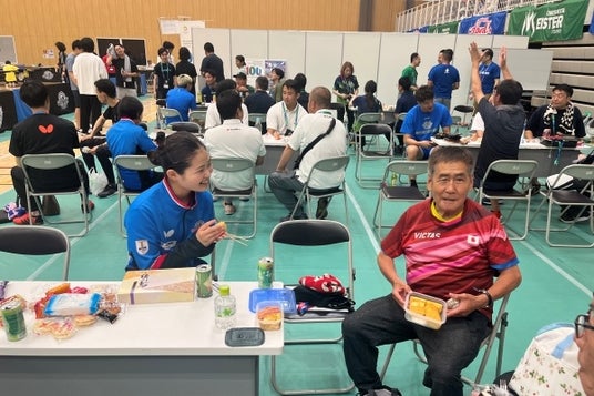 当日は試合進行に合わせて急遽スケジュールを変更し、予選リーグ後に交流試合を組むなどフレキシブルに運営を行いました。また、選手がチームに助っ人として飛び入り参加したり、参加者の皆さんと一緒に昼食を取ったりするなど、通常の「競技」としての卓球ではなく、「交流」を目的としたアットホームな雰囲気で卓球をお楽しみいただきました。