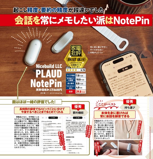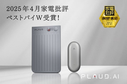 Nicebuild LLC社が運営するPLAUD.AIの高性能AIボイスレコーダーが、2025年4月の家電批評ベストバイをW受賞しました。「PLAUD NotePin」は今回2度目の受賞となります。