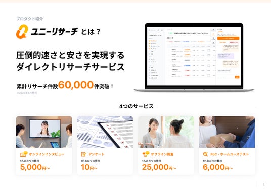 ユニーリサーチは調査会社を介することなく、スピーディーかつリーズナブルに直接顧客の声の収集が可能なダイレクトリサーチサービスです。「オンラインインタビュー」、「アンケート」、「オフライン調査」、「PoC・ホームユーステスト」が、セルフ型で最短当日かつ従来調査費用の10分の1以下で実施可能です。累計3,000社、60,000件以上の調査実績を誇る、国内最大級のリサーチサービスです。