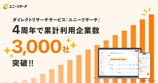 株式会社プロダクトフォース(所在地:東京都港区、代表取締役CEO:浜岡 宏樹 以下 プロダクトフォース)が運営するダイレクトリサーチサービス「ユニーリサーチ」は、サービス提供開始から4周年を迎え、累計の利用企業数が3,000社を突破したことをお知らせします。