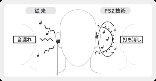 PSZ技術は、NTTのコンピュータ&データサイエンス研究所で開発され、耳をふさがずに、耳元だけに音を閉じ込めます。「ある音波に、180度反転させた波形(逆位相)を重ねると干渉し合って音が消える」原理を応用しています。nwmの耳スピーカー「耳スピ」では、音を打ち消すために逆位相を活用する斬新な発想とともに、度重なるシミュレーションとハードウェア改良によってバランスの良い音質を実現。耳元付近の360°に音を閉じ込め、音漏れを最小限に抑えています。