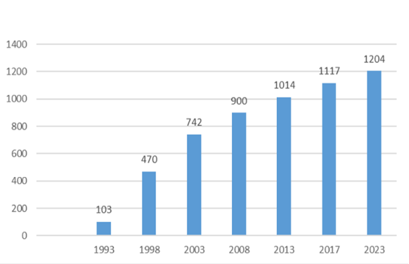 本研究所が研究対象とする「道の駅」は、休憩や物販、飲食、地域の観光情報発信などを目的とした一般道路沿いに市町村などが設置し、国土交通省が道の駅として登録、第3セクターやJA、地元企業など民間セクターが指定管理者として運営を担っている「公設民営施設」です。旧建設省(現国土交通省)が、道の駅の登録・案内制度を1993年4月に作り、4月22日に全国で103か所の道の駅がまず登録されました。以来、その数は30年間で10倍以上に増え、2023年2月時点で1204か所を数えます(図1)。運営サイドの創意工夫で、ドライバーの休憩機能や交通情報の発信にとどまらず、地場産業振興、地域コミュニティの活性化、交流人口の増大、地域防災力の向上、買い物難民対策など、それぞれの地域が抱える多様な課題解決の拠点としての役割も果たしています。