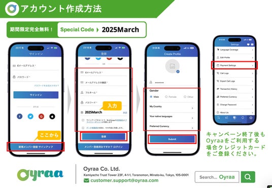 153言語2,700名の通訳者からのサポートを必要なときに予約不要で1分から利用できる通訳アプリ『Oyraa』を提供する株式会社Oyraa(本社:東京都港区、代表取締役社長:コチュ・オヤ、以下:当社)は、この度期間限定キャンペーンの開催を決定したことをお知らせいたします。