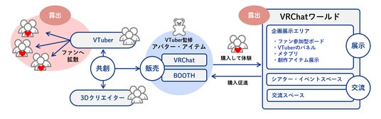 今回の実証実験では、発信力を持つVTuberと技術力を有する3Dクリエイターによる共創モデルに着目し、「VRChat」上での創作・流通・発信の仕組みを構築することで、新たな収益機会やファンとの関係構築の可能性を検証し、その環境の構築を目指します。