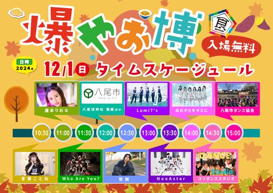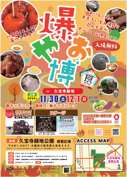 日本の食まつり実行委員会(事務局:大阪府守口市 実行委員長:枦山義彦)は、八尾市と共催で11月30日(土)、12月1日(日)に大阪府八尾市の久宝寺緑地修景広場にて、地域の魅力を存分に楽しめるフード&エンタメイベント「爆やお博2024秋」を開催します。