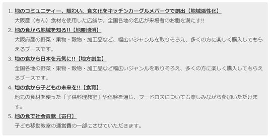 食を通して地域と人がつながるイベント。食は日本が世界に誇る文化です。恵まれた環境の中で日本の食文化は進化し、ハイクオリティーな衛生管理や出汁文化などの素材を活かした手法で、安心安全で美味しいを世界に誇ってきました。その結果、おいしくて健康的な「食」にまで発展しました。