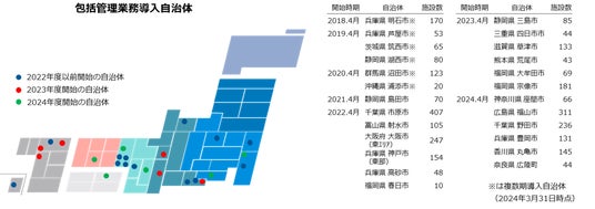日本管財の公共施設包括管理業務の実績は、現在全国で25件となり、市場シェア率は業界トップ*です。2024年度からは、新たに6件(座間市・福山市・野田市・豊岡市・丸亀市・広陵町)の地方公共団体で業務を開始しました。今後も全国的に包括管理を導入する自治体の増加が見込まれることから、更なる事業の拡大に取り組んでまいります。