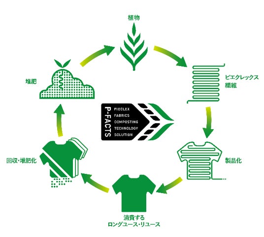 「P-FACTS」(PIECLEX FAbrics Composting Technology Solution)は、ピエクレックス社が主導し、植物由来のポリ乳酸を原料とした素材である「電気の繊維」ピエクレックスを使用したアパレル製品や繊維製品を回収し、林業や農業での利活用を目的とする堆肥化までを、パートナー企業、自治体、福祉施設、学校法人等、多くのステークホルダーと連携・共創し構築した、透明性高い循環インフラです。「P-FACTS」の推進により、消費者の皆様が気軽に参加できる、地域で使用し地域で再利用する“地着地消地循”が可能な真のサステナブルファッション社会の実現を目指します。