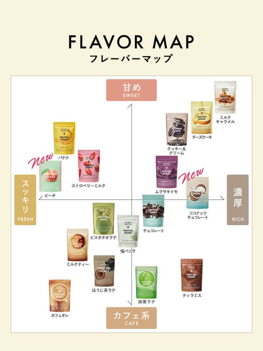 お客様が飽きずに毎日の生活に取り入れていただけるよう、多彩なフレーバー展開をしています。今回、14種類の定番フレーバーに夏季限定の「ココナッツチョコレート」と「ピーチ」を加え、さらに豊富な選択肢を提供します。どちらも夏を感じさせる爽やかな味わいが特徴です。