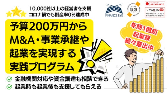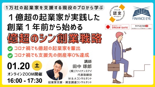 株式会社ファイナンスアイ(本店:大阪府大阪市、代表取締役:田中 琢郎。以下、ファイナンスアイ)は、M&A売却で1億超の資産家になる事を目指して独立・開業を目指すスタートアップや起業家に向けた創業セミナー【1億超の起業家が実践していた創業1年前から始める億超のシン創業戦略】を開催します。このセミナーでは、ファイナンスアイが起業支援をおこない億超まで伴走型で支えてきた起業家や経営者が、実際に実践していた創業1年前から始めていたことを学び、起業を成功させる気づきを手にする事ができます。思い付きやアイデアだけで成功できる人もいるかもしれませんが、成功確度を高めるためには戦略が重要です。このセミナーは、起業を考えている人、既に起業済みで将来的にM&Aで事業の売却を考えている経営者にとって必見のセミナーです。開催日時は2024年1月20日(土)16:00にウェビナー形式で開催します。年始に学び、2024年の成功に向けて躍進するきっかけにしてもらえればと思います。