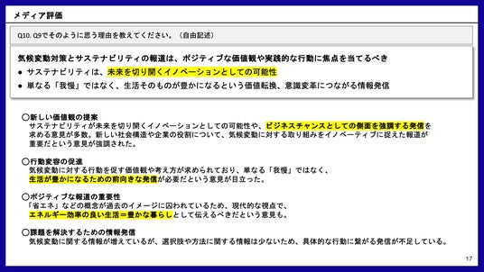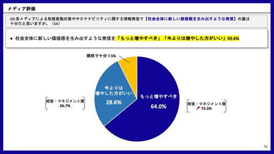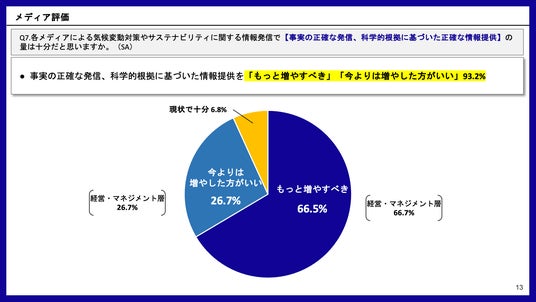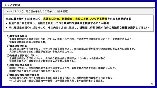 目 的:気候変動に取り組む企業や団体が、メディアによる気候変動報道に対して抱いている意識や期待を明らかにすること。この調査結果をもとに、より深層的かつ多角的な気候変動報道を促進し、社会の意識変革に寄与することを目指す。