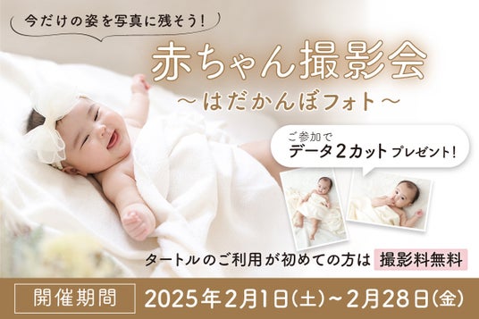東海地方でフォトスタジオを20店舗運営する株式会社タートル(本社:愛知県春日井市、代表取締役社長:亀山直樹)は、2025年2月1日(土)より、赤ちゃんの撮影を2カット980円(税込1,078円)、タートルを初めてのご利用の方は無料で提供するキャンペーン「赤ちゃん撮影会~はだかんぼフォト~」を全店で実施します。