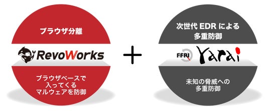 インターネット分離ソリューションにより安全なインターネット環境を提供する「RevoWorks」製品に加えて、パターンファイルに依存しない先進的な振る舞い検知技術により、未知のマルウェアやゼロデイ攻撃からエンドポイントを多層的に防御する「FFRI yarai」を組み合わせることで、より強固なセキュリティ対策と安全な業務環境の構築が可能です。