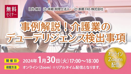 辻・本郷 税理士法人(本社:東京都新宿区、理事長:徳田孝司)は、辻・本郷 FAS株式会社(本社:東京都千代田区、代表取締役:山田翔吾)と共催で「事例解説! 介護業のデューデリジェンス検出事項」セミナーを開催いたします。本セミナーは、デューデリジェンス(以下「DD」)とバリュエーション(以下「VA」)の重要性から、辻・本郷 グループでの実際の事例をもとに、介護業でよくあるDDの検出事項を解説します。介護業でM&Aを通じてグループ拡大を検討している経営者の方向けに、注意点やポイントを説明いたします。