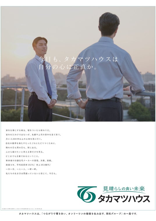 同時に、社員一人ひとりが誠実さと責任感を持ち、自らの成長を楽しめる組織であることも大切にしてまいります。昨年当社が日本経済新聞にて発信した「今日も、タカマツハウスは自分の心に正直か。」というメッセージは、すべての判断と行動の基準として「正直であること」「誠実であること」を掲げ、妥協のない住まいづくりを続けていくという当社の決意表明です。人が成長し、組織が強くなり、事業が発展していく。その循環こそが、当社が持続的に価値を生み続ける源泉であると考えています。
