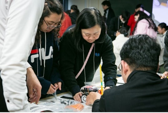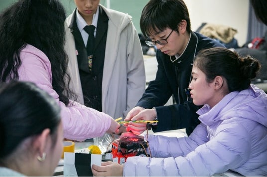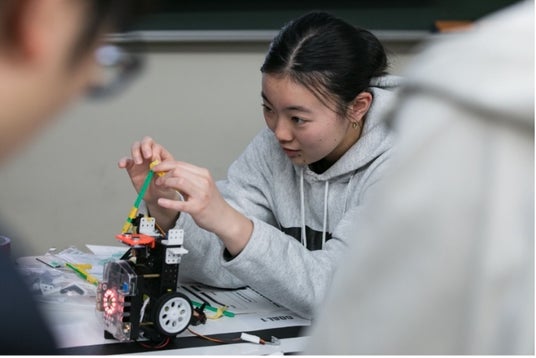 G-ROBOTは2輪ローバーを基礎としたプログラミング教材であり、様々なセンサーをとりつけプログラミングを行うことができます。今回は事前に「黒線にそって移動し、障害物や行き止まりにぶつかると、「静止」「サーボモーター(一定角度に回転するロボットモーター)の動作」を順番に行う」ようプログラムされており、参加者たちは異国のチームメイトたちと議論し、様々な配置の障害物や行き止まりを超えてスタートからゴールを目指すというミッションを課せられています。