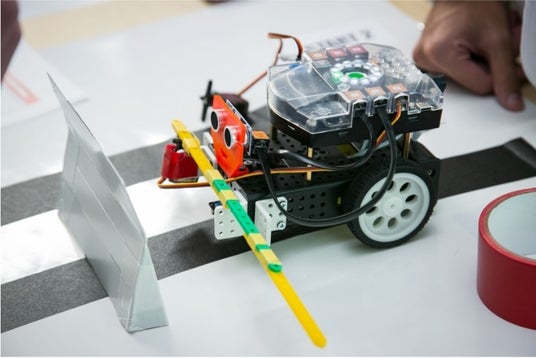 GaraSTEMのG-ROBOT。障害物をサーボモーターにとりつけたアームを使うことでどけてゴールへ向かう