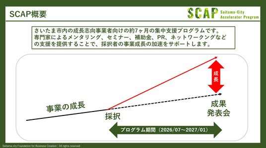 公益財団法人さいたま市産業創造財団(埼玉県さいたま市、理事長:中村雅範)は、さいたま市内の成長意欲ある事業者の集中支援を目的として、「さいたま市アクセラレータープログラム(SCAP)」を開催します。プログラム公式ウェブサイトを公開しており、6月5日まで参加事業者を募集中です。成長意欲あるさいたま市内事業者からの応募をお待ちしています。