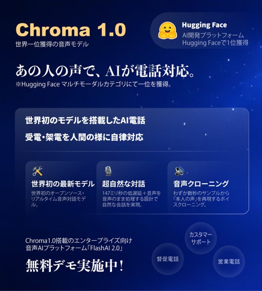 Chroma 1.0は、世界最大のAIコミュニティHugging Faceにおいて、音声の人間らしさと1秒以下の超低遅延応答速度で世界1位を獲得した、世界初のエンドツーエンド音声対話モデルです。