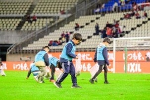 選手たちが激しいプレーを繰り広げた後のピッチは、ところどころ芝が剥がれ凹んでいます。子どもたちは飛び出した芝生片を拾いながら、選手のプレー跡が残る試合後のピッチを体感しました。