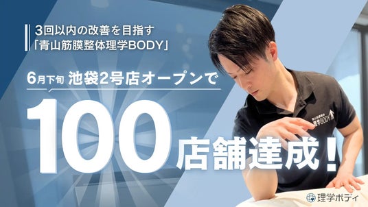 株式会社理学ボディ(本社:東京都渋谷区、代表取締役:木城拓也)は、“通わせない整体”というコンセプトを掲げる「青山筋膜整体理学BODY」が、このたび全国100店舗を達成したことをお知らせいたします。記念すべき100店舗目となる「池袋2号店」は2025年6月下旬にオープン、現在、各店舗でもご予約を受け付けております。