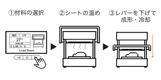1.材料の選択、2.シートの温め、3.レバーを下げて成形・冷却 の3ステップのみの簡単操作!さらに、加熱開始や成形終了はビープ音で通知されるため、スムーズに作業を進めることが可能です。
