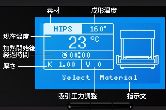 オフィスや作業場にも置けるようなサイズ感と操作の手軽さが特長のVaquformですが、その内部にはセンサ管理のセラミックヒータとプロレベルの吸引力を持つ真空ユニットを搭載しています。操作時はパネル上で材料の種類と厚さを選択するだけで加熱温度や吸引圧力等のパラメーターを呼び出すことができるため、成形の仕上がりにバラつきがなく、常に再現性の高い成形品を作ることができます。