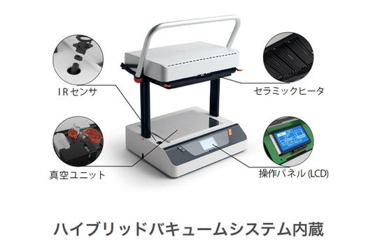 型とシート(登録材料:HIPS ABS PVC PETG PMMA PC HDPE PP KYDEX EVA VFLEX、厚み:0.2~3.0mm)を用意するだけで様々な用途の成形品を作ることができるので、包装する物や形状に合わたオリジナル性の高い製品を作ることが可能です。卓上ですぐに使える手軽さで、シート材料選定の試作や形状確認、商品包装の検討といった工程をスピーディーに進めることが可能になります。