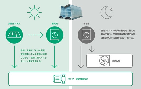 栽培施設では、上部と下部に設置された太陽光パネルが日中に発電を行い、水を循環させるポンプや各種センサー類を稼働させながら、同時に電力をバッテリーに蓄えています。気温の下がる寒冷時や夜間には、その蓄電を活用して空調設備やポンプを稼働させ、常に植物の生育に最適な温度環境を維持できるよう設計されています。