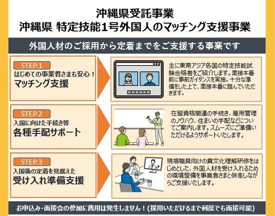 「令和6年度 特定技能1号外国人のマッチング支援事業」は、沖縄県の介護人材の不足を解決するために、県内介護施設などと特定技能1号外国人介護人材の就労希望者とのマッチングを支援し、特定技能による就労希望者の円滑な受け入れ支援体制の構築を図ることを目的としています。