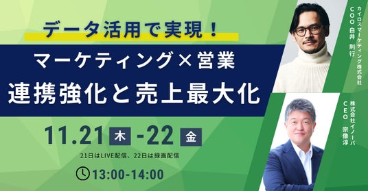 企業の成長にフィットする、MA/SFA一体型プラットフォーム「Kairos3(カイロススリー)」を提供するカイロスマーケティング株式会社(本社:東京都渋谷区、代表取締役:佐宗 大介、以下「当社」)は、株式会社イノーバとの共催セミナー「データ活用で実現!マーケティング×営業の連携強化と売上最大化」に当社取締役 COO 白井 則行が登壇することをお知らせします。
