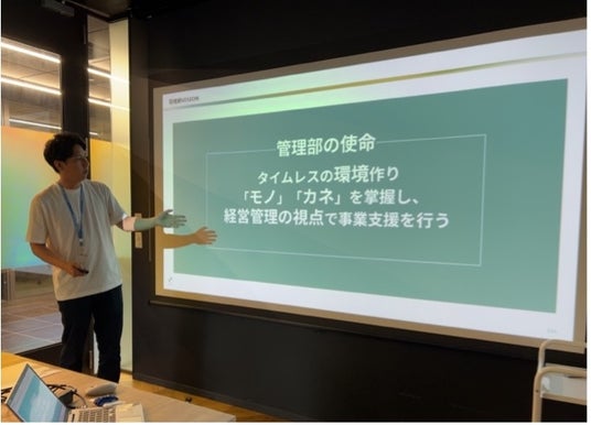 まず、管理部より弊社の生い立ちやMVV、ブランドプロミスなどの会社説明をいたしました。その後、豊洲オフィスにて懇親会が行われました。また、部長陣から各部署の概要や各部のMVVに対する想いをご説明し、全社理解をより深めました。