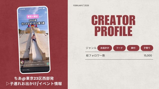 「ちあ@東京23区西部発▷子連れお出かけ/イベント情報」は、子どもが楽しめるお出かけスポットを中心に取材を行い、動画の制作・発信をしています。これまでの投稿の中には、再生回数62万回を超える動画も。子育て分野に強みを持つ同メディアの加盟により、子育て関連の新商品・スポットなどの認知拡大が期待できます。