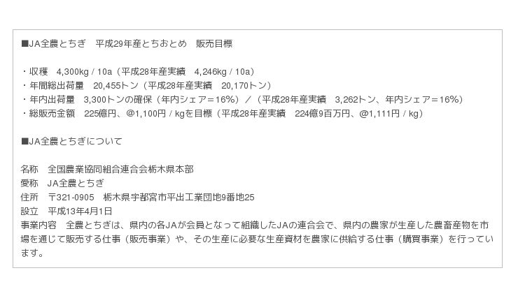 JA全農とちぎでは、平成29年産『とちおとめ』を「いちご王国とちぎ」の主力品目として、年間で225億円の販売額を目指してまいります。さらに、期待の新ブランド『スカイベリー』の安定供給および品質の高位平準化に注力してまいります。より多くの皆様に「いちご王国とちぎ」のいちご『とちおとめ』・『スカイベリー』のファンとなっていただけるよう、今シーズンも、より一層の販売活動を展開してまいります。