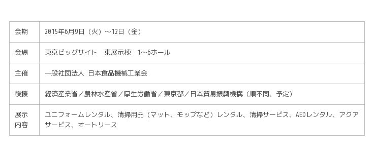 株式会社サニクリーン(東京都港区三田・代表 山田健)は、2015年6月9日(火)から6月12日(金)まで東京ビッグサイトで開催される「 FOOMA JAPAN 2015 国際食品工業展」に出展いたします。今回は「食品工場および飲食店の衛生管理」をテーマに、最新の「ユニフォームレンタルサービス」および「レンタルマット」などの商品・サービスを紹介いたします。
